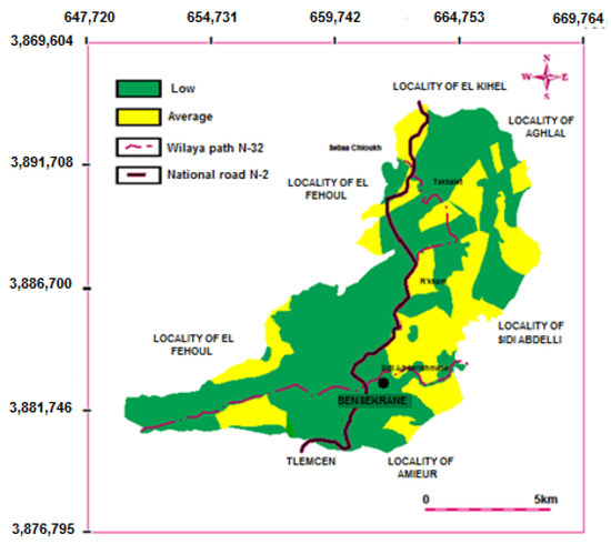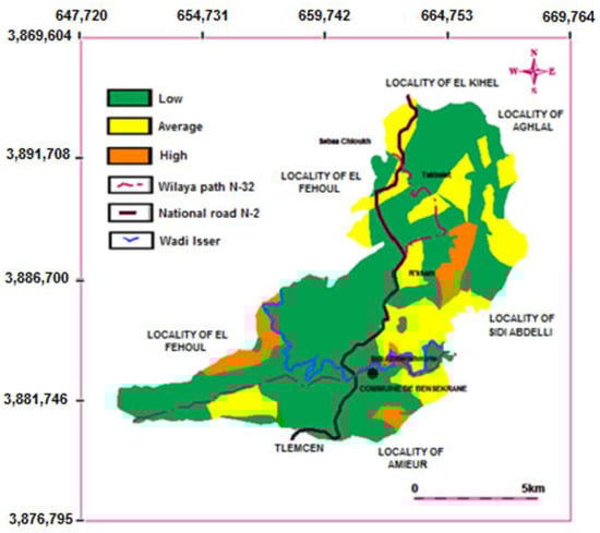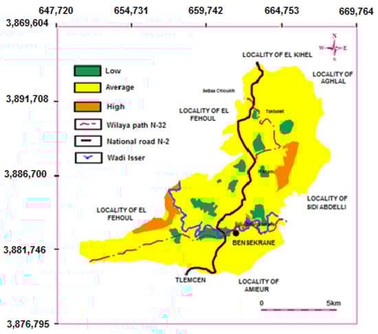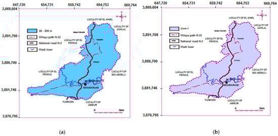 Dynamic factors were included in the modified Farès method. This included the groundwater, the seismicity and the vegetation cover [15]. The piezometric surface of the groundwater in the municipality of Bensekrane is shown in Figure 5a [15,39]. The level of the groundwater is situated at a depth between 80 m and 200 m [39]. Concerning the effect of the groundwater level, the indices were assigned based on the depth as follows: [9,15,37]: IN = 1 for 75–100 m, IN = 2 for 50–75 m, IN = 3 for 25–50 m, IN = 4 for 0–25 m. In the present case, (IN) was taken equal to 1.