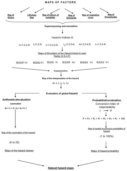 All the maps were prepared using MapInfo GIS in vector mode. Figure 7 represents a summary of the methodology applied in obtaining the hazard maps. It was enough to have the maps of the trigger factors considered; then, it was necessary to determine the risk indices for each factor, which were translated into partial probabilities. The evaluation of global hazard was achieved by arithmetic and probabilistic evaluation. The result obtained represented hazard classes, which allowed us to obtain two hazard maps: the first for the arithmetic evaluation and the second for the probabilistic evaluation.