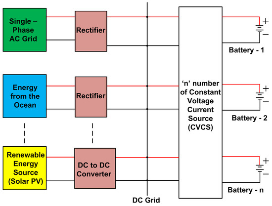 A significant issue that needs to be addressed is the reduction in waiting time before charging. One of the ways to reduce this is by installing more charging stations. While this process can reduce the waiting time before charging, installing more charging stations is related to other variables, such as land availability and acquisition and availability of power supply. Increasing the number of charging stations may not be a very simple or practical solution. In addition to optimizing the number of charging stations, it would be of great help if simultaneous charging of multiple EVs with the same or different rating batteries could be implemented. In a scenario where there are 10 chargers in a charging station, with each charger capable of charging 1 EV at a time, 10 EVs can be charged at any given time. This is shown in Figure 1. If it is possible to charge more than 1 battery (say, 2) in 1 charger, then the charging station described above can charge 20 EVs simultaneously. This creates a significant reduction in waiting time. This will directly create a positive impact on the conversion from ICEVs to EVs for mass-use. An added advantage will be obtained if multiple EVs of different ratings (say, an electric-bike and an electric-car) can simultaneously be charged by the same charger. This is shown in Figure 2. In addition to reducing waiting time, simultaneous charging also leads to higher profit for the company that installs and maintains the charging station since more vehicles can be charged in a given time-period, leading to an overall increase in the number of vehicles that are being charged each day. With this, we can conclude that simultaneously charging multiple batteries of the same and different ratings offers many advantages to customers and companies.