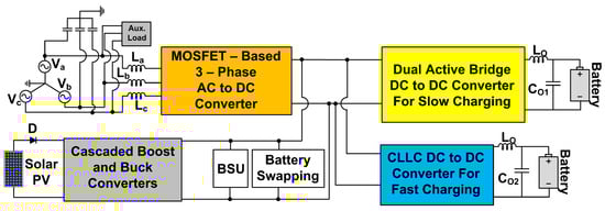- Sun, F.; Li, S.; Liu, Y.; Xie, C.; Zhao, Q.; Shi, Y. The Power Electronic Transformer based Multi-port DC Charging Station. In Proceedings of the 2020 12th IEEE PES Asia-Pacific Power and Energy Engineering Conference (APPEEC), Nanjing, China, 20–23 September 2020; pp. 1–5. [Google Scholar]
