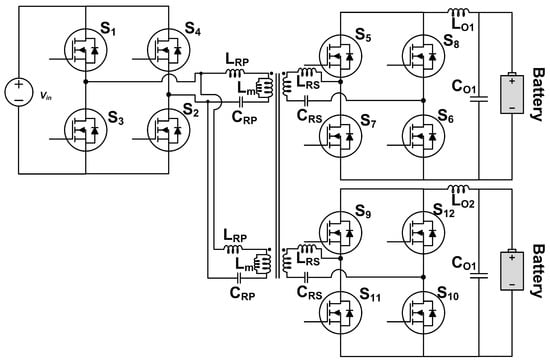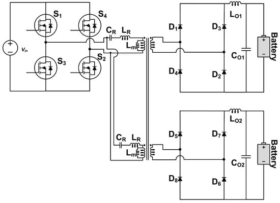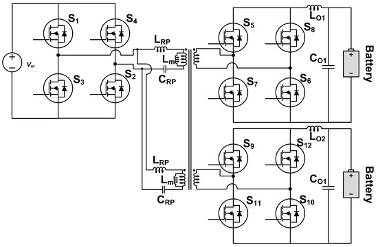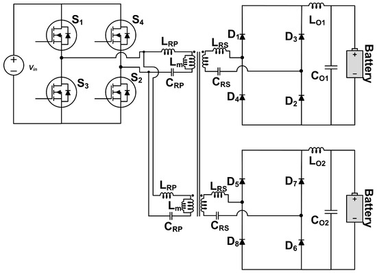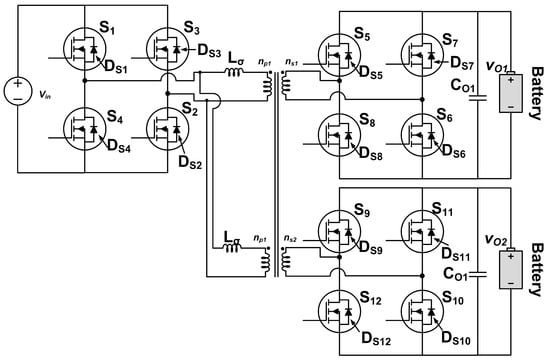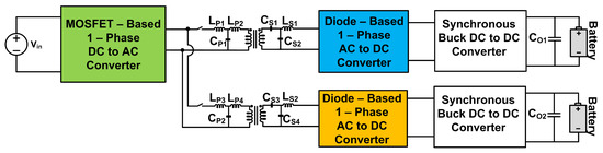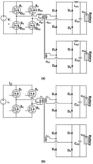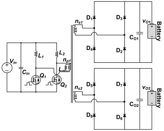Several authors have provided a detailed review of the various converters that can be used for EV battery charging. Khalid et al. [42] have reviewed the various isolated and non-isolated converter configurations that suit EV battery charging. In addition, the authors have provided the configuration of a charging station for fast charging, which includes the AC-DC multilevel converters. The concept of universal chargers has been described in work with various charging methods. However, the work does not deal with simultaneous charging and the corresponding modifications in the converters. In addition, the required design equations and loss calculation are beyond the scope of the review. Ghasemi-Marzbali et al. [43] have dealt explicitly with the infrastructure for fast charging of electric vehicles. The work gives details of the studies required for the charging station design, site selection and size determination, charging time estimation, and modeling of renewable energy resources for charging stations. The demand-side management principle has been introduced with risk factors and reliability considerations. The application of machine learning for system design has been described with a particular focus on fast charging stations. However, the work does not describe any converter topology required in the charger since the work’s objective is to review fast charging station requirements. Chakraborty et al. [44] have reviewed the various DC-DC converter topologies with a special focus on EV battery charging. Several isolated and non-isolated DC-DC converter topologies have been described in the work. Under the isolated converter topologies, full-bridge, current-fed converter, sinusoidal amplitude high voltage bus converter, and multi-input single output converters have been described. Design formulae for the memory elements have been provided for the described converters. The architecture of fast charging stations has been provided with a description of converters for the AC-DC and DC-DC conversion stages. In the DC-DC stage, full-bridge and phase-shifted full-bridge topologies for single-battery charging have been described. Common equations for loss estimation have been provided with the comparative efficiency for various switching frequencies. Various performance parameters have been compared for the described converters. However, the work does not describe loss estimation specific to the converters and does not include details for simultaneous charging. In addition, only some isolated converters have been described in previous work.