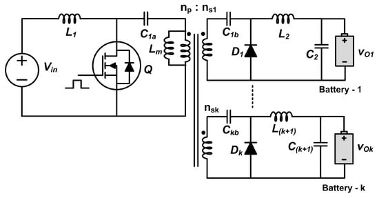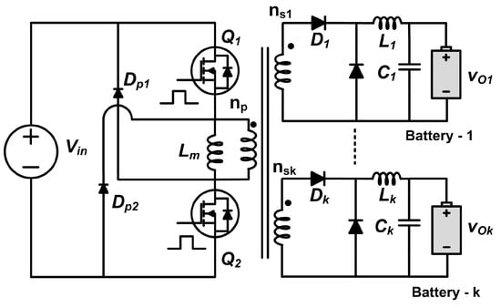 - Chakraborty, S.; Jain, A.K.; Mohan, N. Novel converter topology and algorithm for simultaneous charging and individual cell balancing of multiple Li-ion batteries. In Proceedings of the INTELEC 2004. 26th Annual International Telecommunications Energy Conference, Chicago, IL, USA, 19–23 September 2004; pp. 248–253. [Google Scholar]