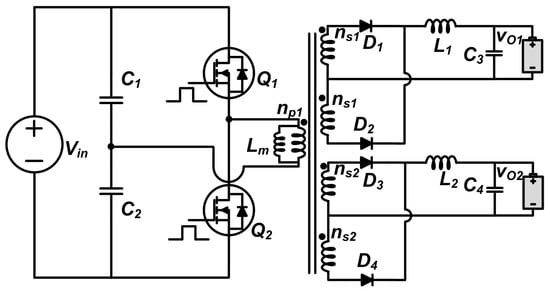 - Hyeon, B.C.; Cho, B.H. Multiple output of dual half bridge LLC resonant converter using PFM-PD control. In Proceedings of the 2009 IEEE Energy Conversion Congress and Exposition, Detroit, MI, USA, 9–13 October 2009; pp. 1133–1140. [Google Scholar]