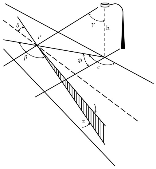 The angle α is the angle of observation from the horizontal plane, the angle β is between the vertical plane of incidence of light and the vertical plane of observation, the angle γ is the angle of incidence of light, and the angle δ is the angle between the road axis and the vertical plane of observation (see Figure 1). The angle δ is usually neglected and the angle α is kept constant at 1–2° (due to the drivers’ viewing height of 1.5 m and obstacle detection 60–160 m in front of the driver) [20].