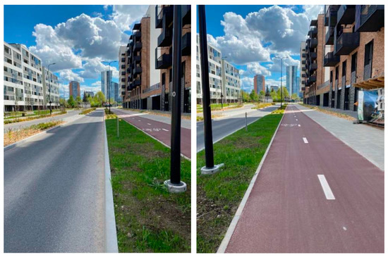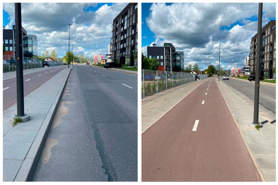 The carriageway and the bicycle path on Linkmenu street in Vilnius city were chosen as the second research object (see Figure 3). It is assumed that the pavement of the carriageway was installed about 10 years ago (no historical data were found). The bicycle path was installed in 2020. The wearing layer of the bicycle path consists of red color asphalt concrete mixture AC 5 and the wearing layer of the carriageway of asphalt concrete mixture AC 11.