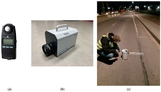 All the measurements were recorded at night-time. The illumination E was measured using a lux meter device (see Figure 4a), surface luminance L was measured with a LumiCam 1300 camera (see Figure 4b), and longitudinal and transverse slopes were measured with a digital level (see Figure 4c). To assess the texture of the pavement surface, measurements of the average profile depth were performed with a laser profilometer according to the requirements of the standard EN ISO 13473-1 (see Figure 4c).