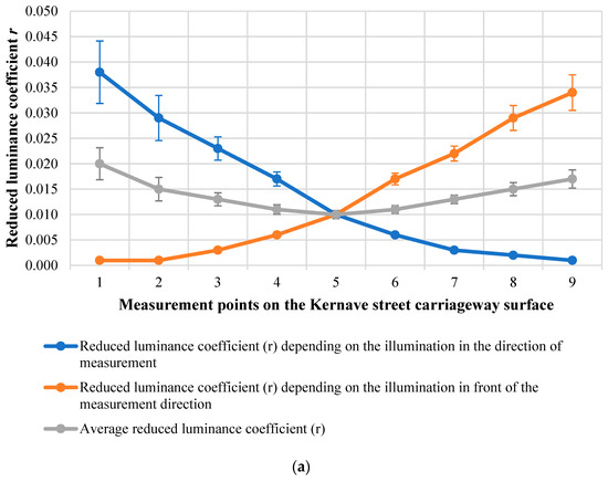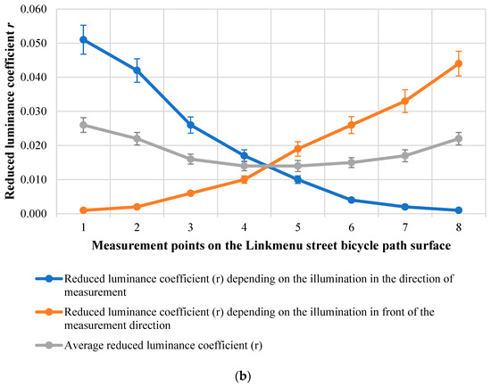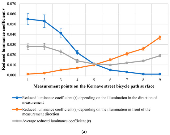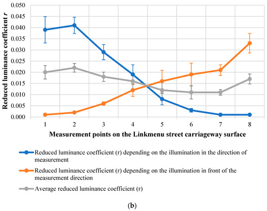 The calculated mean reduced luminance coefficient r of the dry surface of the carriageway on Kernaves street varies from 0.010 to 0.020. The reduced luminance coefficient varies from 0.001 to 0.038 for left-side illumination and from 0.001 to 0.034 for right-side illumination. In the middle of the considered section, the mean reduced luminance coefficient is the lowest at point 5 (0.010) and the highest is found at the point closest to the measurement location—at point 1 (0.038) (see Figure 9a). The calculated mean reduced luminance coefficient r of the dry surface of the carriageway on Linkmenu street varies from 0.011 to 0.022. The lowest values of the mean reduced luminance coefficient of the carriageway were determined not in the middle of the section, but at the right lighting pole at points 6 and 7 (0.011), and the highest at point 2 from the left lighting pole (0.022) (see Figure 9b).