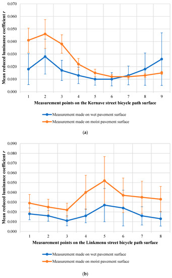 The calculated mean reduced the luminance coefficient r of the dry pavement of the bicycle path on Kernaves street varying from 0.010 to 0.028, depending on the distance from the lighting. The lowest mean reduced luminance coefficient r is in the middle of the considered pavement: at point 5 (0.011) and point 6 (0.010) (between the lighting poles), the highest is at the points closest to the LumiCam 1300 camera location—at points 1 and 2 (0.028) (see Figure 7a). The calculated mean reduced luminance coefficient r of the dry surface of the bicycle path on Linkmenu street varies from 0.014 to 0.026. As in the previously analyzed object (Kernaves street bicycle path), the lowest mean reduced luminance coefficient is at the middle point between the lighting poles (0.014) and the highest at the closest point to the LumiCam 1300 camera location—at point 1 (0.026) (see Figure 7b). Comparing the reduced luminance coefficients of the bicycle paths of both research objects in the case of a dry pavement surface, it was found that the mean luminance coefficients are distributed within similar limits and differ slightly.