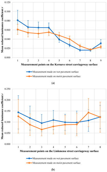 The analysis of the reduced luminance coefficients of the carriageways on Kernaves street and Linkmenu street have showed that the mean reduced luminance coefficient r of the dry pavement surface in the Kernaves street (0.014) is 12.5% lower than in the Linkmenu street (0.016) and about two times lower than it was found by other researchers [23]. Significant changes in the mean reduced luminance coefficient were found when comparing wet and moist surfaces. The mean reduced luminance coefficient r of the wet pavement in Kernaves street (0.045) is 59% lower than in Linkmenu street (0.111). Additionally, the mean luminance coefficient r of the moist pavement in the Kernaves street (0.042) is 58% lower than in Linkmenu street (0.100).