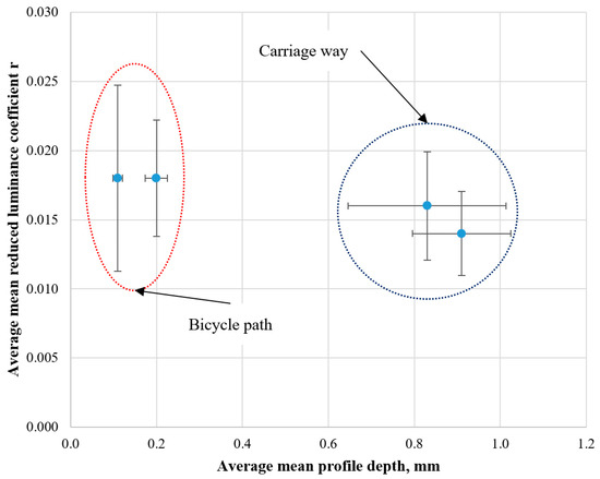 However, there is a tendency to have different distributions for asphalt pavements with different colors (see Figure 11). For that purpose, the average values of the mean reduced luminance coefficient and the mean profile depth determined in the investigated sections were analyzed. The average value of the mean profile depth of the bicycle path with red asphalt pavement located on Kernaves street is 0.11 mm and on Linkmenu street is 0.20 mm. Analyzing the values of the mean profile depth of the carriageway, it was found that the mean profile depth is 0.91 mm on Kernaves street and 0.83 mm on Linkmenu street (see Table 1). The average mean reduced luminance coefficient is calculated for the bicycle path at about 0.018 (red asphalt pavement) and for the carriageway at 0.014–0.016 (black asphalt pavement), respectively.