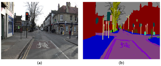 The Cambridge-driving Labeled Database (CamVid) [20] was utilized largely for capturing diverse urban and suburban driving scenarios (including dusty and bright), especially in the United Kingdom. A Panasonic HVX200 stereo camera collected the driver’s perspective for two hours and the footage was recorded in high definition at 30 frames per second (FPS). This video has a resolution of 960 × 720 pixels, which has already calibrated every video frame using intrinsic and extrinsic techniques. All the driving sequences were reduced from 2 hours to 22 min to generate this dataset. It consisted of processed video sequences and ground truth labels. Figure 2 shows an example of input and ground truth images from the CamVid training set.