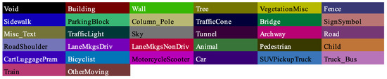 CamVid provided 701 pairs of input and annotated images at the pixel level that were annotated for visual objects as polygons. The hand-crafted labeling procedure required around from 20 to 25 min per input image and the total duration of this process required approximately 230 h. The proportions of CamVid dataset were divided into three parts: 367 for training, 101 for validation, and 233 for further testing sets. In addition, as shown in Figure 3, there are 32 distinguishable semantic classes of visual objects, such as Building, Wall, Tree, Road, Pedestrian, Car, and Sidewalk.