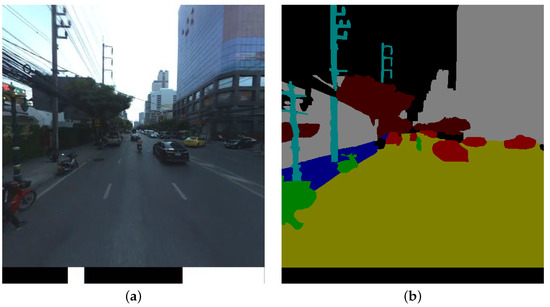 Sample images for the Bangkok Urbanscapes training set. The input image is displayed in (a), while the ground truth is displayed in (b).