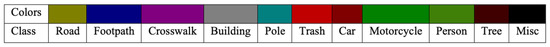 The Bangkok Urbanscapes dataset provided 701 pairs of input and annotation images with a resolution of 512 × 544 pixels. This dataset consists of 367 training, 101 validation, and 233 testing sets; the distribution of this dataset is equivalent to the CamVid dataset. The sample images of the training set of the Bangkok Urbanscapes dataset are shown in Figure 4. The corresponding semantic classes for eleven classes (Road, Building, Tree, Car, Footpath, Motorcycle, Pole, Person, Trash, Crosswalk, and Misc) are shown in Figure 5.