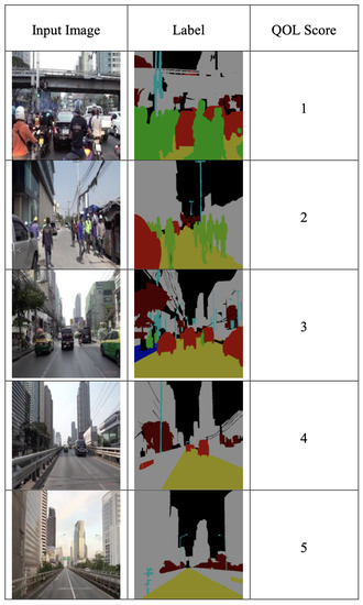 We collected the Bangkok driving scenes dataset of 355 images with QOL scores [35] from one to five representing the interviewees’ satisfaction with driving in that scene. The sample images on our dataset are shown in Figure 5. Then, we select 100 images of them to craft labels for 11 segmentation classes, i.e., Road, Building, Tree, Car, Footpath, Motorcycle, Pole, Person, Trash, Crosswalk, and Miscellaneous (Misc). We used the LabelMe platform [36,37] to annotate labels on these selected images. The semantic colors with these classes are similar to the Bangkok Urbanscapes dataset, shown in Figure 6. We use these images to evaluate the semantic segmentation results in terms of mean IoU. This process took approximately 100 h to accomplish. We also conduct the peer-review process to control the quality of labels. The segmentation results are provided in Section 4.1.