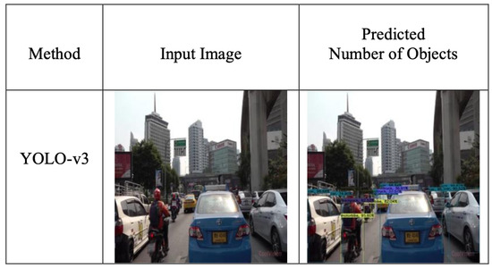 We employ the pre-trained weight of YOLO-v3, which is trained from the COCO dataset. This method can detect the number of road objects on our dataset. The attributes from YOLO-v3 are represented in terms of the number of road objects. These objects include cars, persons, motorcycles, and trucks. The YOLO-v3 inference result is shown in Figure 7.