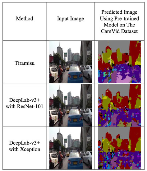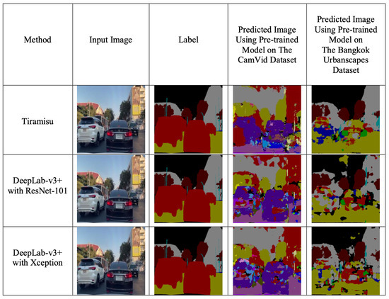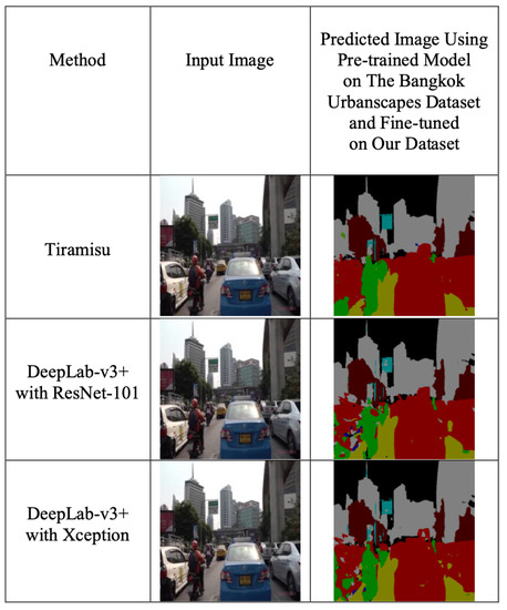 Our experiments explore the performances of segmentation architectures on the labeled images on the Bangkok roads (including Bangkok Urbanscapes and our datasets). We make semantic segmentation inferences using the original pre-trained model trained using the CamVid dataset, including Tiramisu, DeepLab-v3+ with ResNet-101, and DeepLab-v3+ with Xception, then compare them to the results using the model fine-tuned with the Bangkok Urbanscapes dataset. The comparison of the segmentation results will be provided in Figure 12.