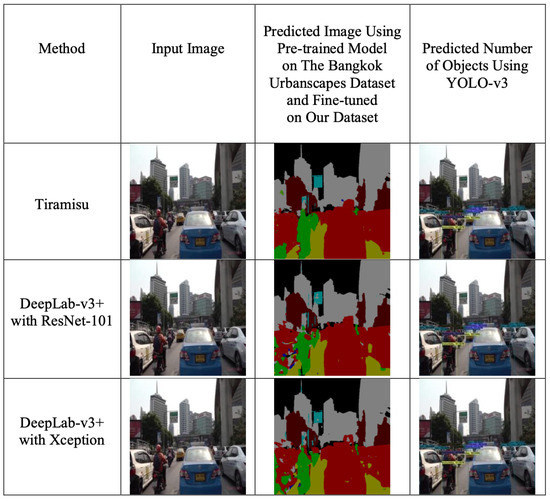 We provide the overview of our framework as shown in Figure 1. We first apply the semantic segmentation architectures such as DeepLab-v3+ with a residual neural network for 101 layers (ResNet-101) [34], DeepLab-v3+ with Xception, and Tiramisu on our dataset. These models can classify every pixel on the input image regarding the classes of its training set. For example, a pre-trained segmentation model from the Bangkok Urbanscapes dataset produces the segmentation regions for each input image, where the semantic colors represent the definitions of vision objects, as shown in Figure 5. When we obtain the output image from the pre-trained model, we calculate the percentage of pixels for each semantic class from the predicted image. We then obtain the extracted attributes from the predicted images, where the percentage of pixels represents the proportion of the visual object that participates on the road. Next, we employ the pre-trained weight of the object detection model as YOLO-v3 to extract the number of vehicles on our dataset, where this number represents how much the vehicle appears on the road. These extracted attributes will be applied to the linear regression model as part of our QOL prediction model. Our first step results are shown in Section 3.6 and the further details of hyperparameter configurations for segmentation methods are shown in Section 3.4.1.
