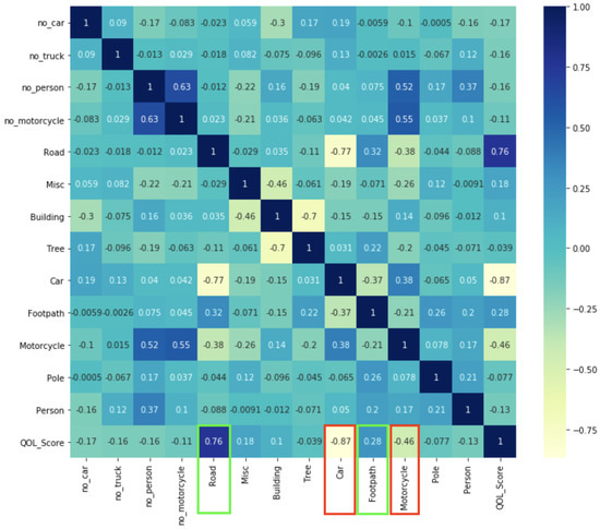 In the regression analysis in Equation (3), we can explain the linear relationship between the extracted factors and the QOL scores using the correlation heat map shown in Figure 14. If the color of the extracted attribute is more intensive in the blue tone, the linear relationship is more positive, corresponding to the QOL scores. On the contrary, the color of the extracted attribute represents a yellow zone and the linear relationship will then be negative to the QOL scores. We consider the bottom of the horizontal axis showing the extracted factors regarding the QOL scores. The green highlighted attributes show the positively correlated segmentation attributes with a high rate to the QOL Scores as shown in Figure 14, e.g., 0.76 and 0.28, which are the percentages of roads and footpaths, respectively. However, the red highlighted attributes are negative segmentation attributes with a high rate to the QOL scores, containing 0.87 and 0.46 for the percentages of cars and motorcycles, respectively. We can conclude from the heuristic knowledge that the road and footpath areas positively affect the interviewee’s sentiment. However, traffic congestion can cause the interviewee to feel negative about the driving environment.