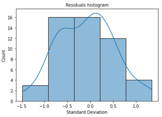 The histogram of the residual plot from Equation (3) that displays the normality of the residuals calculated using , which represents the error from the linear regression model.