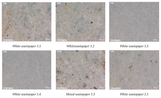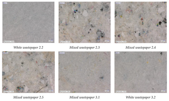 Results of microscopic analysis of impurities on the surface of the tested paper are presented in Figure 1. Significant amounts of impurities were observed on the surface of papers produced from mixed wastepaper due to the higher content of impurities in the pulp.