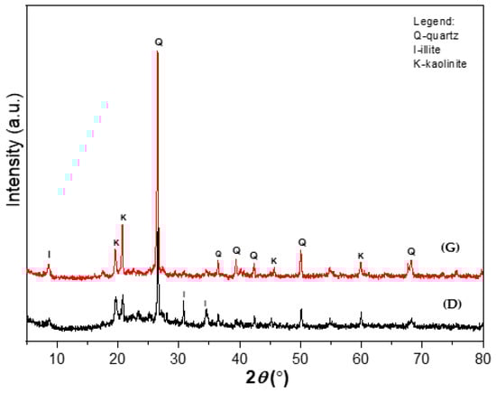 As can be seen from the identified phases of the powder diffractogram (Figure 1), the clay mineral phases represented in both clays were: kaolinite and illite, while quartz was the secondary mineral that accompanied these clay samples [43]. In the sample of Serbian clay (D), slightly more peaks belonging to the illite phase were identified, indicating a probably slightly higher content of illite in this sample compared to the sample of German clay (G). The kaolinite clay used for this research has already been described [26], and depending on the sampling locality of the clay itself, the results pointed to the illite phase, which occurs in different proportions in the sample itself [26,44].