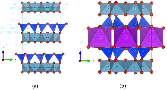 Kaolinite and illite are clay minerals with a layered structure. From a chemical point of view, these are hydrated silicates of K, Na, and Mg, and from a chemical and structural point of view, these minerals have a significant content of OH groups. Clay minerals from a structural point of view can be represented as different orientations and interconnections among the octahedral and tetrahedral layers in the structure [45]. Figure 2 illustrates the crystal structure of kaolinite and illite.