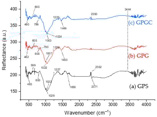DRIFT spectrum of geopolymer samples: (a) GPS; (b) GPG; (c) GPGC.