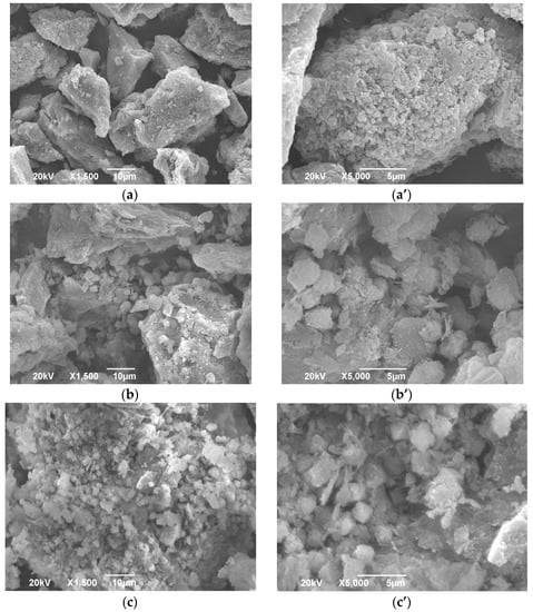 SEM micrographs of geopolymers samples: (a) GPS- magnification of 1500; (a’) GPS- magnification of 5000; (b) MG- magnification of 1500; (b’) MG- magnification of 5000; (c) MGC- magnification of 1500; (c’) MGC- magnification of 5000.