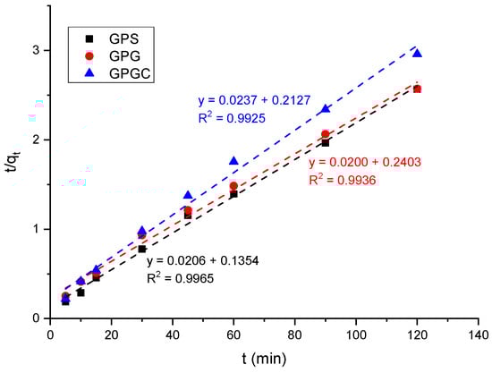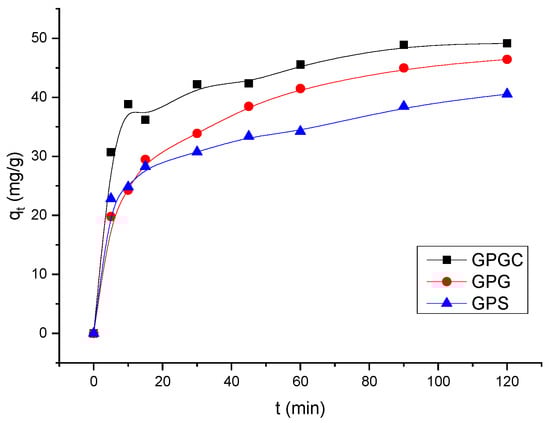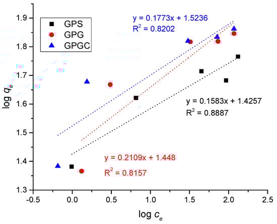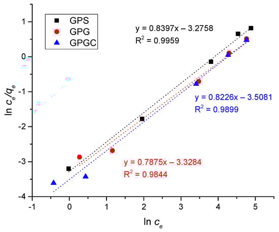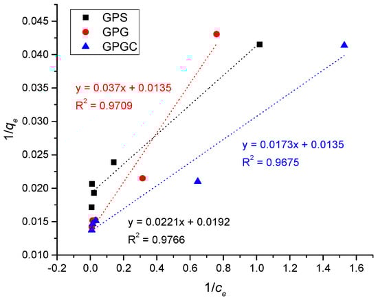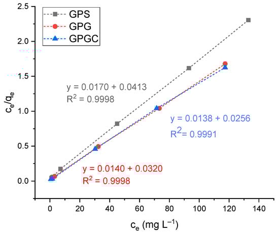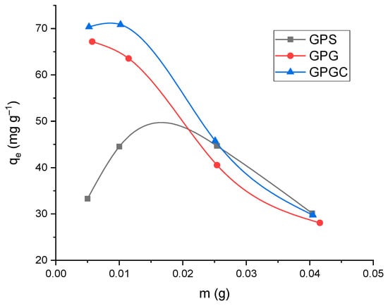 where c0 and ce (mg L−1) were initial and equilibrium Cu(II) ions concentrations, respectively, m is the mass of the adsorbent sample (g) and V is the volume of metal solution (L). Regarding the maximum adsorbent surface occupancy at GPS—the sample was at 0.015 g of the sample mass. At the highest doses of adsorbent, the adsorbent surface was fully occupied by Cu(II) ions, and the amount of metal on the adsorbent surface could not have been higher. Different adsorbent sample composition accounted for the different shapes of the plot qe vs. m by the GPS sample. The composition of the individual samples was described in Section 3.1. The most effective adsorbent was the GPGC sample, which is consistent with the theory of increasing the specific surface area by adding a carbon [62].