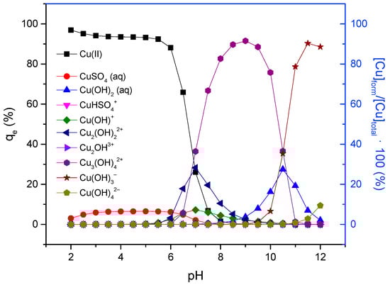 The visualization of precipitated forms was calculated with the software Visual MINTEQ v. 3.1 and the database minteqa.dat. From Figure 9 it is clear that the precipitated forms of Cu(II) begin at pH 6.5 approximately. The pH value in which the precipitated form was initiated depends significantly on the initial concentration of Cu(II) in the water solution, the temperature, and the atmospheric pressure. The data were interpreted as a function of qe or a percentage of a selected form of Cu(II) cation and pH value. The experimental results of pH value before and after the adsorption process showed that the pH values of approximately 5.4 after adsorption of Cu(II) by geopolymers samples agree well with the theoretical calculation of speciation processed as summarized in Figure 9. The precipitation process of Cu(II) ions in insoluble hydroxides of Cu start at pH values higher than pH = 6 [62,63,64,65].
