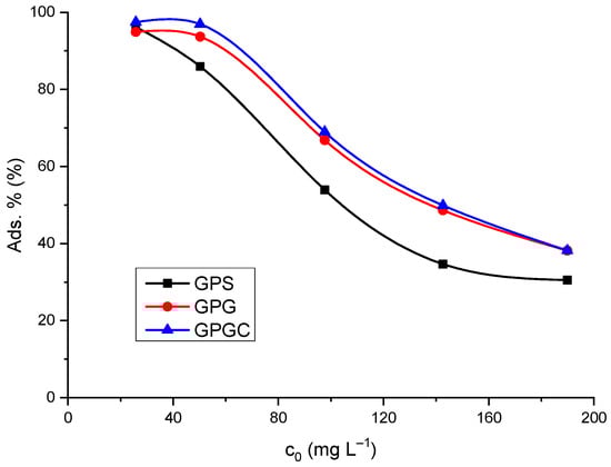 Higher equilibrium adsorption capacities (qe) were found for GPGC and GPG adsorbents (72.86 mg g−1, 70.29 mg g−1, respectively); GPS adsorbent showed lower efficiency with an equilibrium capacity of 58.30 mg g−1. The adsorption capacity of geopolymers can be expressed in percentages of adsorption. Figure 11 illustrates the dependence of adsorption % on the initial concentration of Cu(II) in solutions for geopolymer samples. The highest experimental adsorption capacity at a concentration of Cu(II) 25 mg L−1 had a geopolymer GPGC (96.92%); the lowest geopolymer GPS (85.93%).