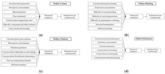 Next, in the online seminar model, it was found that perceived usefulness influenced the intention to use continuously, and the concerns about poor seminars influenced perceived usefulness. The main factor affecting the intention to use of online seminar services in the previous literature is the perceived ease of use (Bailey et al. [68], Djojo et al. [66], and Lee et al. [69]). Moreover, according to Lee et al. [69], in addition to the perceived ease of use, self-efficacy, academic engagement, interactivity, and social presence have a significant effect on the perceived usefulness of online seminars. Park et al. [70] proved that institutional support and voluntariness have an effect on the perceived usefulness of teleconferencing systems, while anxiety does not. The result of the study by Park et al. [70] indicating that anxiety does not affect perceived usefulness is contrary to this study’s result indicating that concerns about poor sensitivity affect perceived usefulness. It seems that different results came out because it was concerned about the seminar becoming poor rather than the technology itself in this study, while anxiety means “the extent to which independents feel unconvincing when using or considering a certificate technology” in the study by Park et al. [70]
