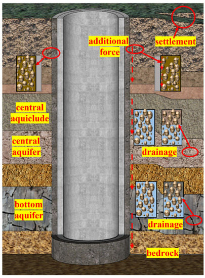 The depth of the shaft continues to increase with the demand of coal resources, and the fracture disasters in vertical shafts, induced by the complex stress, are becoming increasingly frequent, which affect the operation of the entire mine and threaten the safety of personnel [1,2,3,4]. The stresses mainly consist of the vertical stress and the horizontal stress. The horizontal stress can be divided into the lateral pressure from the surrounding stratum, pore water and the horizontal additional force. The lateral pressure has been taken into account and reflected in the designed parameters, and the horizontal additional force generally occurs only in very special cases, such as asymmetric settlement of the topsoil around the shaft; thus, the horizontal stress is not generally considered to be the main cause of shaft wall fracture as the horizontal pressure can be calculated and predicted. The vertical stress mainly consists of the gravity generated by itself and its appendages, which can be calculated directly, and the constantly changing vertical additional forces induced by the long-term slow drainage settlement. The vertical additional force, which is usually induced by the drainage settlement, is recognized as the most important reason for making the shaft fracture, based on a series of studies [5,6,7]. The failure mechanism involves the consolidation settlement of the topsoil during drainage, which enhances the friction force of the shaft wall due to the huge modulus difference between these two materials, while the synchronization or asynchronization of multiple aquifers accelerates the rate of settlement and increases its total level, thus posing a greater threat to the shaft wall, as shown in Figure 1 [8]. Therefore, understanding the additional force caused by the drainage settlement of topsoil containing multiple aquifers is necessary in order to guarantee the safety of the shaft during deep coal resource mining.