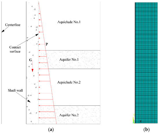 A collection of the theoretical analyses of additional forces, when drainage settlement occurs in a single aquifer, in topsoil has been studied. Based on simulation experiments and actual engineering monitoring studies, Cui [9] concluded that the vertical additional force generated by mining activities or artificial drainage is the main reason for shaft wall fractures. Huang et al. [10] studied the variation in vertical additional forces acting on the shaft wall during alluvial drainage using large-scale vertical shaft simulation experiments. They found that the vertical additional forces increase linearly with increasing aquifer depressurization and proposed that the vertical retractable shaft structure should be used to prevent shaft wall fractures caused by alluvial drainage. Yang [11,12] studied the stress states and failure modes of shaft walls under various load magnitudes and found that the additional force is the most important reason for rupture hazards in shaft walls. In addition, Liu et al. [13] simulated the whole fracturing process of a shaft wall and studied the relationships between the additional force and parameters. Li et al. [14] analyzed the interaction of these two materials based on previous studies, under drainage conditions, and concluded that water loss from the bottom aquifer potentially leads to non-mining-related shaft wall fractures, and that the additional force increases with an increasing water level gap.