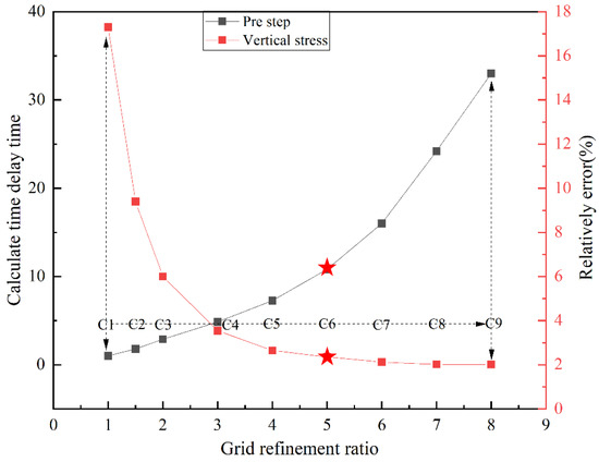 In this model, a two-dimensional planar unit PLANE 82 is used to simulate the shaft wall. A contact unit module between the stratum and shaft wall is used to simulate friction conditions. In order to reduce the effect of interface on the calculation results, the simulation model was demarcated and modified based on sufficient field data and a series of model calculations. Half of the shaft model is taken to simplify the calculation based on the axisymmetric characteristic, and the topsoil is simplified into two aquicludes and two aquifers. Figure 2 shows the simplified computational model and the finite element model. Furthermore, the maximum vertical stress on the shaft wall (all factors were selected as the typical value) were simulated, and the calculated time delay ratio and relative error were selected as evaluation factors for the grid sensitivity test, as presented in Figure 3; the mesh C6 was selected for the calculation model by considering the combination effect of calculation time and relatively error, while this error was acceptable from the perspective of numerical calculation.