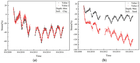 The field strain data of the three shafts, in the Dongtan Coal Mine, during their service time were tested, collected and analyzed (as shown in Figure 4) to verify the reliability of the numerical model in this study. The regression coefficient of b, with different types of soil in different depth locations, which are the most important parameters for the additional force, was inversely calculated according to strain data and compared with that in the theoretical parameter in this study.