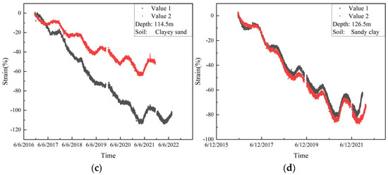 Field strain of shaft wall: (a) clay layer surrounding the north ventilation shaft, (b) sand layer surrounding the north ventilation shaft, (c) clayey sand layer surrounding the west ventilation shaft, (d) sandy clay layer surrounding the west ventilation shaft.