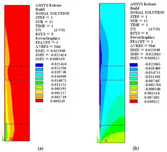Displacement contour of shaft wall combined with the stratum in equilibrium: (a) displacement in X-directional, (b) displacement in Y-directional.