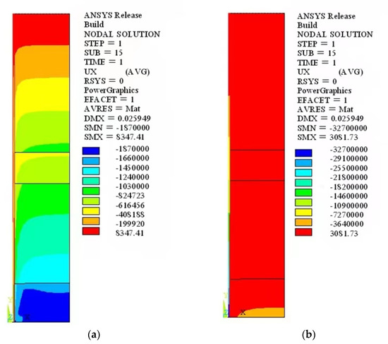Stress contour of shaft wall combined with the stratum in equilibrium: (a) stress in X-directional, (b) stress in Y-directional.