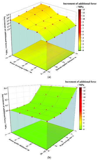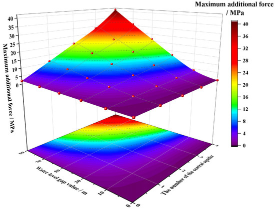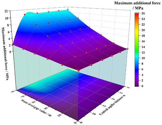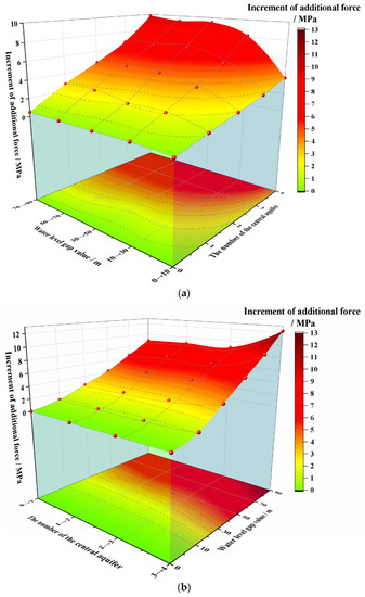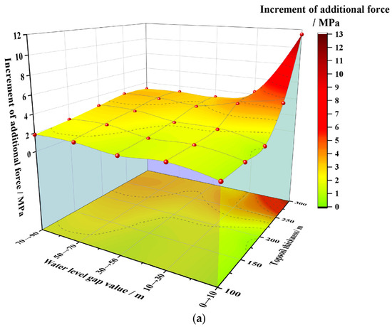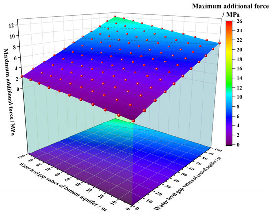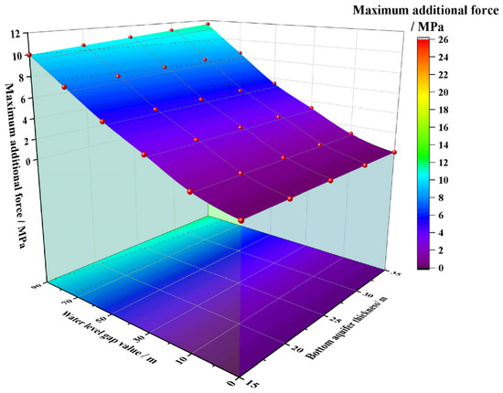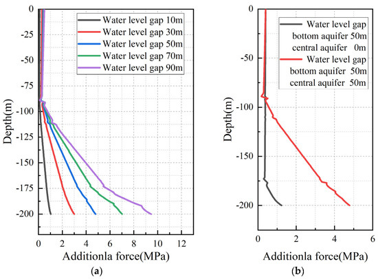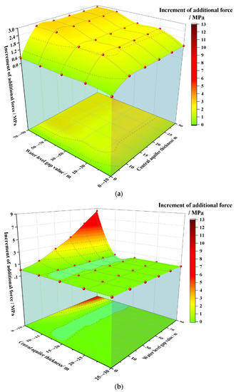 The increment in this force shows a relatively slower growth rate as the water level gap grows when the central aquifer thickness is constant, as shown in Figure 19a. The maximum additional force shows an increment of less than 3 MPa when the water level gap changes 20 m. Moreover, the variance in the additional force would obviously be influenced by the appearance of the central aquifer instead of the increase in the central aquifer thickness. In Figure 18, the maximum additional force ranges from 2.02 MPa to 10.99 Mpa, with a water level gap of 90 m, when the thickness changes from 0 m to a value of 10 m; however, the maximum additional force remains nearly 11 MPa when the central aquifer thickness continues to rise to 30 m. The increment in the additional force decreases to nearly 0 Mpa, with an increasing water level gap, when the thickness exceeds 30 m, as shown in Figure 19b. These results are similar to those of the force of the bottom aquifer thickness.