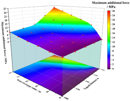The relationships curves of the topsoil thickness and additional force with different water level gap values are shown in Figure 10. The additional force grows when the topsoil shows an increased trend under different water level gap conditions. For instance, this force ranges from 4.13 MPa to 5.28 MPa, with a water level gap of 50 m, when the topsoil thickness ranges from 100 m to 200 m, while this value increases to 18.87 MPa when the thickness reaches 300 m. This phenomenon indicates that the appearance of drainage has a large impact on the subject of the additional force. The maximum additional force reaches 25.19 MPa when the topsoil thickness is 300 m under a water level gap of 90 m. This phenomenon may be because the occurrence of drainage reduces the water pressure and enhances the effective stress of the overlying sediment, which results in the settlement and causes the additional force. The whole settlement amount increases and then induces a larger additional force as the topsoil thickness increases. To further illustrate the effects of the range in topsoil thickness and water level gap on this force, the proportional relationships of the maximum additional force with an increasing water level gap and topsoil thickness are calculated and shown in Figure 11.