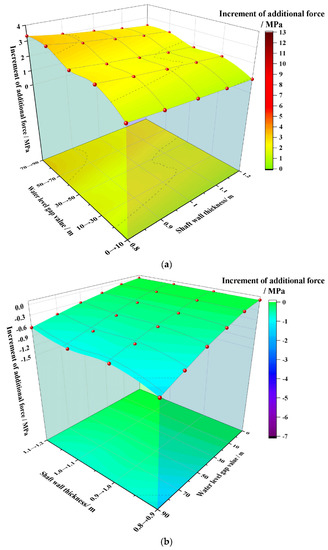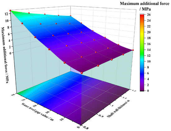 The relationships between the maximum additional force, the water level gap and the shaft wall thickness are calculated and shown in Figure 13, where it can also be seen that the increment of the increase in maximum additional force continuously grows when the water level gap shows an increasing trend, while the increment magnitude of this force decreases. This phenomenon can be proven by the fact that the increment amplitudes with water level gap values of 70~90 m and 10~30 m are 3.31 MPa and 2.48 MPa when the shaft wall thickness remains at 0.8 m, while these two values are 2.37 MPa and 1.78 MPa when this thickness ranges to 1.2 m. Increasing the thickness can reduce the additional force and enhance the bearing capacity of the shaft and effectively prevent shaft wall fractures. However, the reduction in the maximum additional force also decreases with increasing thickness of the shaft wall; for example, the reduction in the maximum additional force is approximately 0.66 MPa, for a water level gap of 90 m, when the thickness of the shaft increases from 1.1 m to 1.2 m. Hence, the shaft safety produced by increasing the wall thickness does not match its construction cost, so it is necessary to design the wall thickness reasonably by considering the actual shaft situation and economic benefits.