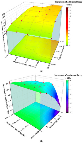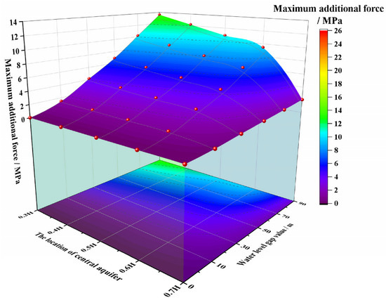 This force also presents a constant increase trend with the increasing water level gap, as shown in Figure 21a. The increment in the additional force decreases constantly, with the decreasing height of the central aquifer, when the water level gap is constant. For example, the increment in the additional force decreases from −1.39 MPa to −7.38 MPa, with a water level gap of 90 m, when the location decreases from 0.3 H to 0.7 H, as shown in Figure 21b. Therefore, measuring and acquiring the location is important for predicting the range of this force. Furthermore, the increment in the additional force changes from 0.95 MPa to 2.49 MPa when the location is 0.6H, and when the water level gap changes from 0 m to 90 m. In contrast, the increment decreases abruptly when the location is 0.7 H, and only ranges from 0.26 MPa to 0.46 MPa due to the consistent water level gap increase, as shown in Figure 21a. This phenomenon may be because the additional force is mutually neutralized when the central aquifer is located at a greater depth, which means that a threshold value exists for the depth of the central aquifer in terms of its effect on the additional force.