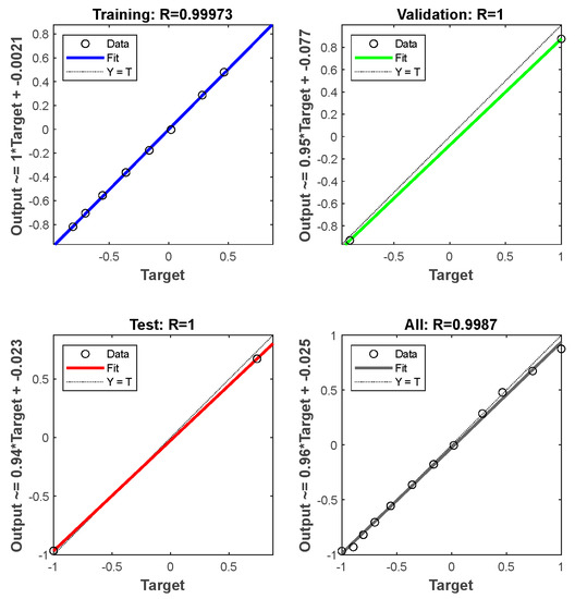 From the correlation graph of the PSO-optimized BP neural network in Figure 7, it can be seen that the regression coefficients of the training, validation and test groups are 0.99973, 1 and 1, respectively, and the regression coefficient of the overall training sample reaches 0.9987, indicating that the correlation between the predicted and true values obtained by the PSO-optimized BP neural network model is very strong, and the model at this point has a high prediction accuracy of car ownership [23].