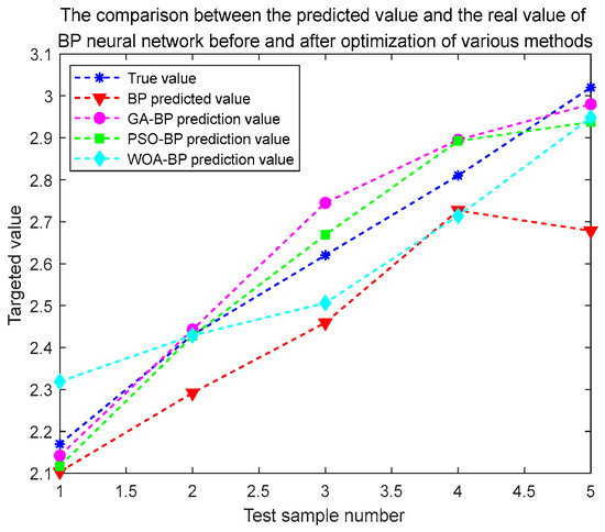 In order to ensure an effective comparison, the intelligent optimization algorithm sets the same parameters in the number of populations and the number of iterations, and the fitness function is the same as the particle swarm optimization algorithm, which uses the mean square error between the real value and the predicted value of the sample. The prediction results and prediction errors of BP neural network optimized by the genetic algorithm and whale optimization algorithm are shown in Table 7.