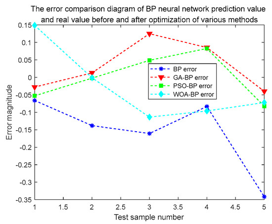 Error comparison between predicted value and actual value before and after BP neural network optimized by various optimization algorithms.