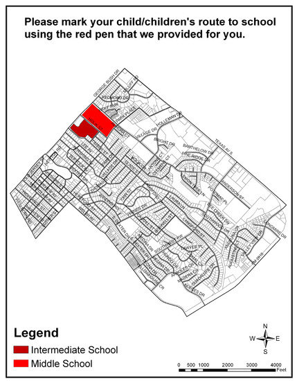 The commute to school was measured with the question, “For each child, write the average number of times your child travels to and from school within one week.” The list of commute modes included walk to school, bike to school, ride the school bus to school, ride in a car to school, ride in a carpool to school, and other (explain). We also asked parents to mark their children’s route to school on a school walk zone map that was included in the questionnaire (see Figure 1).
