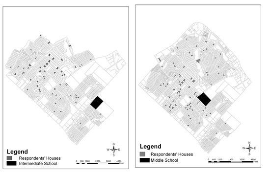 We selected two intermediate (grades 5–6) and two middle (grades 7–8) schools in College Station, Texas. These four schools have three walk zones; that is, two of the four schools have the same walk zone (Figure 1). A total of 370 survey questionnaires were mailed to households with intermediate and middle school children within these school walk zones. Participants’ addresses were obtained from the Independent School District. Among the 370 survey questionnaires, 10 questionnaires (3%) were returned with a vacancy notice, while 186 questionnaires (50%) were completed and returned: 84 from the two different intermediate schools and 102 from the two middle schools. The participants were scattered throughout the study area (Figure 2).