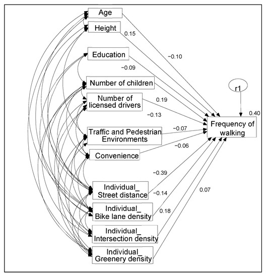 Figure 3 shows the final path analysis and the parameters that were estimated. This final analysis only included significant parameters. The fit indices for the analysis are presented in Table 5. The analysis indicated that age, concerns about traffic and pedestrian environments (factor 2) and convenience (factor 3), parent’s education, the number of driver’s licenses, individual bike lane density along the commuting route, and street distance had negative influences on the frequency of walking. On the contrary, children’s heights, the number of children, intersection density, and trees and shrubs along children’s commuting routes had positive influences on children’s frequency of walking to school.